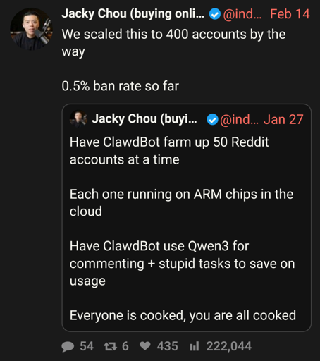 ByteOnBikes@discuss.online · 20 hours agoClawdbot farm owner shares his bots have a 0.5% ban rate so far on redditplus-squarediscuss.onlineimagemessage-square43linkfedilinkarrow-up1257arrow-down15