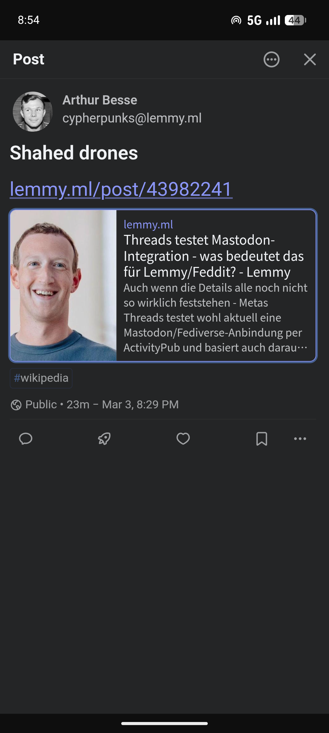 when i browse my lemmy profile via your mastodon instance i see that my first post of this same wikipedia article (to [email protected]) does render correctly there - it is only this cross-post i made to [email protected] which has the wrong preview. (if you figure out why, i’d be curious to know!)