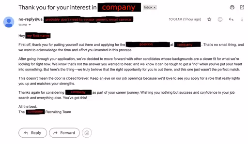 Some think this isn’t an LLM (I still disagree), but either way I find the message to be incredibly patronizing. My effort doesn’t feel acknowledged when their not putting any effort into rejecting me.