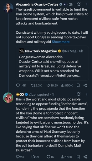 AOC was in support of the “Iron Dome”, the NYM is besmirching AOC saying that she doesn’t care for the lives of “innocent” people when she was among those who wanted to protect them when funding for the iron dome was previously debated. It’s good of you to ask.