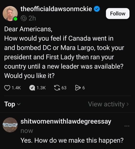 It feels weird rooting for another country, but the USA sucks big donkey dick right now. I’m team Iran or anyone who assassinates or abducts trump. Fuck em all.