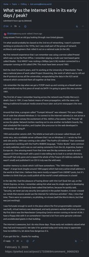 @[email protected] describes working on internet infrastructure back in the 1990s. This was on one of those “drive by” AskLemmys where a new user posts a juicy question, then after a couple hours they delete the topic and their account. However, those posts and comments are still visible in Piefed, ex: https://piefed.social/post/1733969#comment_9969293